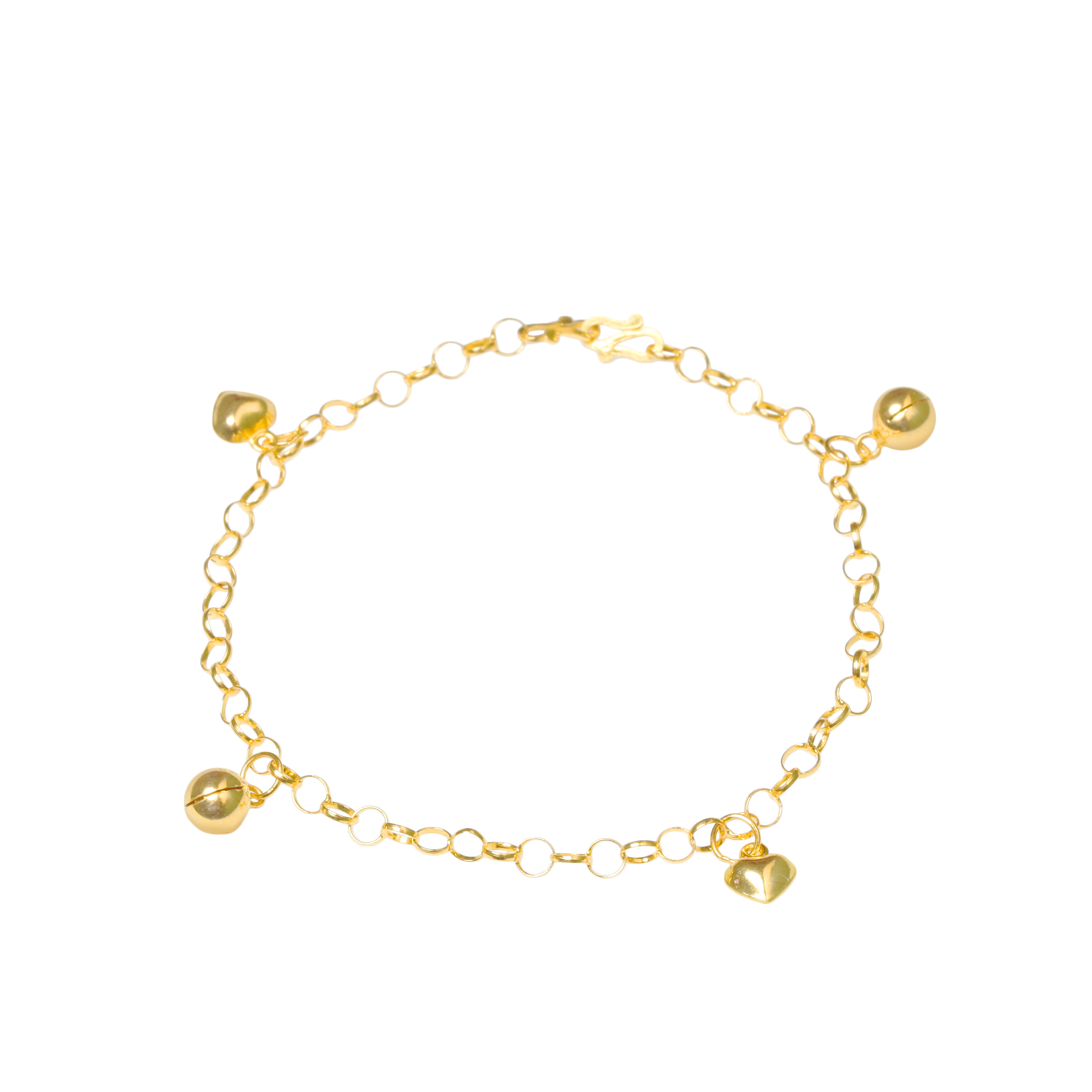 “Ding-a-ling! Ding-a-ling!” The tinker sounds that comes from a happy baby wearing this auspicious baby anklet. Featuring two round-shaped bells and two heart-shaped bells, the jingle of each bell represents love, health, appreciation and success.